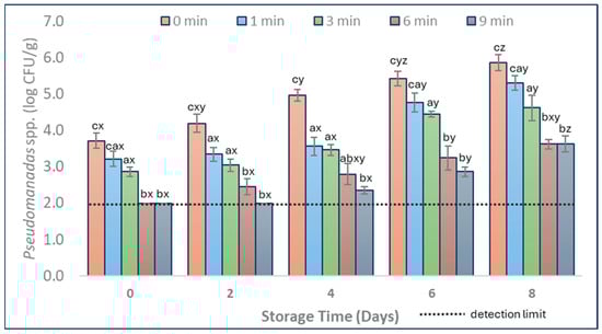 Pseudomonas spp. mean populations in pork samples (vacuum packed, 0–8 days of storage at 4 °C) with different durations of CAP treatment (1, 3, 6, and 9 min) and CAP untreated ones (0 min). Populations are shown as log transformations to base 10. Letters a, b, and c indicate means that differ significantly (p < 0.05) between treatment times on the same day. Letters x, y, and z indicate significant mean differences (p < 0.05) through periods of storage within the same treatment. Error bars indicate the standard deviation; each treatment time was repeated in triplicates, and each set was replicated two times, resulting in n = 6. The detection limit was 2.0 log CFU/g.