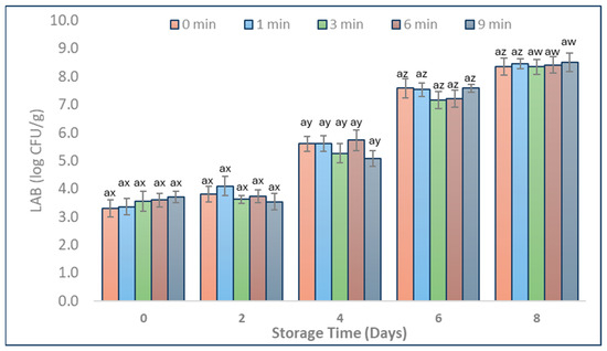 LAB counts in pork samples (vacuum packed, 0–8 days of storage at 4 °C) with different durations of CAP treatment (1, 3, 6, and 9 min) and CAP untreated ones (0 min). Populations are shown as log transformations to base 10. Letter a indicates no significant differences (p > 0.05) between treatments on the same day. Letters x, y, z, and w indicate significant mean differences (p < 0.05) through storage within the same treatment. Error bars indicate the standard deviation; each treatment time was repeated in triplicates, and each set was replicated two times, resulting in n = 6.