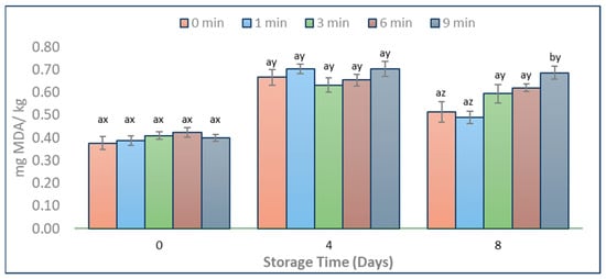 TBARS levels in CAP-treated (1 min, 3 min, 6 min, and 9 min) and untreated (0 min) pork stored at 4 °C. The unit of measure for TBARS is malondialdehyde (MDA) mg/kg. Letters a and b indicate means that differ significantly (p < 0.05) between CAP treatments within the same day. Letters x, y, and z indicate means that differ significantly (p < 0.05) through the different days of storage within the same treatment. Error bars indicate the standard deviation; each treatment time was repeated in triplicates, and each set was replicated two times, resulting in n = 6.