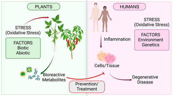Plant-based foods have displayed several benefits to mankind, including bioactive peptides and phenolic compounds, in addition to enhanced dietary health index. Hence, what is the exceptional association between plants and human health? Principally, when plants experience stress (e.g., oxidative stress), they synthesize certain chemical complexes that aid in protection and adaptation against those stressors. For example, plants under salt stress can produce metabolites, such as bioactive peptides, to maintain low intracellular osmotic potential [46]. Another example is the production of phenolic compounds in plant tissue as part of an adaptive response to stressors. Stress conditions that may illicit the production of phenolic compounds in plants include low temperature, pathogen infection, nutrient deficiency, and herbivores [47]. However, in humans, when their cells/tissues experience some stress, such as oxidative stress, it generates inflammation, thereby instigating potential chronic diseases associated with it [48]. Thus, when humans ingest these chemical compounds, they can ameliorate inflammation and the diseases corresponding to it (Figure 1).