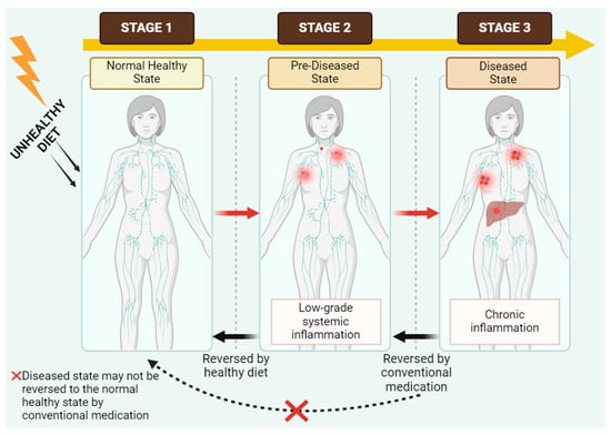 A holistic scheme portraying the association between the consumption of food and chronic diseases (Created with BioRender.com, Accessed on 27 January 2024). The red X indicates that the diseased state is not reversed to the normal healthy state by conventional medication.
