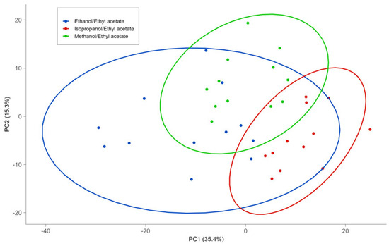 Score plots of PCA of lipids extracted using different solvent mixtures.