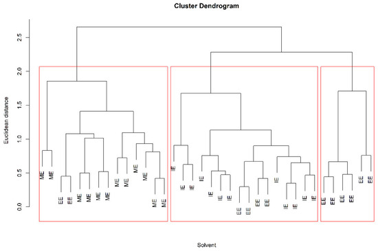Dendrogram of hierarchical cluster analysis (HCA) of different solvent mixtures. Methanol/ethyl acetate (ME), ethanol/ethyl acetate (EE), and IPA/ethyl acetate (IE), all mixtures were at a 1:2 v/v ratio.