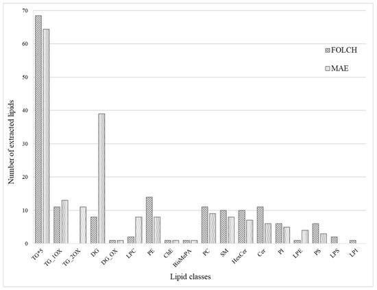 The lipid profile obtained from mozzarella cheese by the optimized MAE method was compared with that of the Folch procedure, and some differences were highlighted. Folch extraction allowed for a higher number of TG and other polar lipids, i.e., PE, PC, SM, Cer, HexCer, PI, and PS (Figure 4). Moreover, LPS and LPI were only extracted using the Folch procedure. These results can be explained by the use of a large volume of methanol in Folch, which allowed for a more efficient breaking of the bonds between lipids and biopolymers [43] and permitted the extraction of the membrane lipids [44] On the other hand, MAE extracted more TG_OX, DG, LPC, and LPE compared to Folch’s procedure. Regarding lysophospholipids, it is reasonable to state that MAEs do not produce these molecules, but optimized extraction conditions can favor their extraction since, as is known from the literature, they are milk components [42]. Differently, oxidized triglycerides, in particular TG with double oxygen, can be linked to the in situ formation by means of microwaves during MAE extraction, but it cannot be excluded that they are milk components because similar compounds were already detected in raw milk [45].