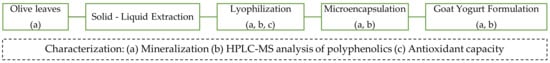 In this study, revalorization of an industrial by-product, namely olive leaves, was proposed through the obtention of a phenolic-rich extract and encapsulation for later implementation in the development of a functional yogurt. Experimental design is summarized in Figure 1.