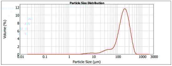 Concerning the physical characterization of microparticles, the results of size distribution of the particles generated by encapsulation of the phenolic compounds are presented in Figure 2. Mean diameter D [4,3] resulted in 191.48 µm, while the median (D50) was 180.91 µm. The polydispersity index (PDI) was 1.48.