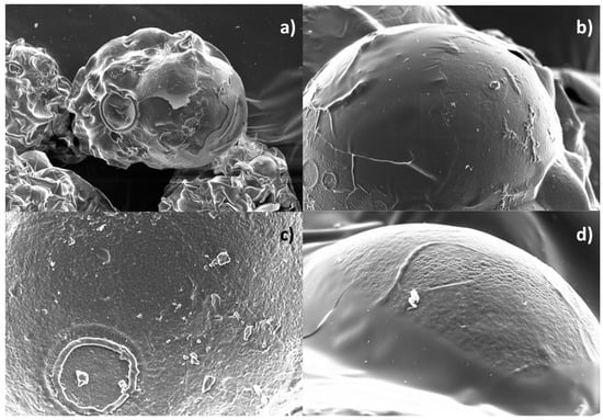 SEM microphotograph of olive leaf extract alginate microcapsules at different magnifications: (a) 500×, (b) 2000×, (c) 5000×, (d) 10,000×.