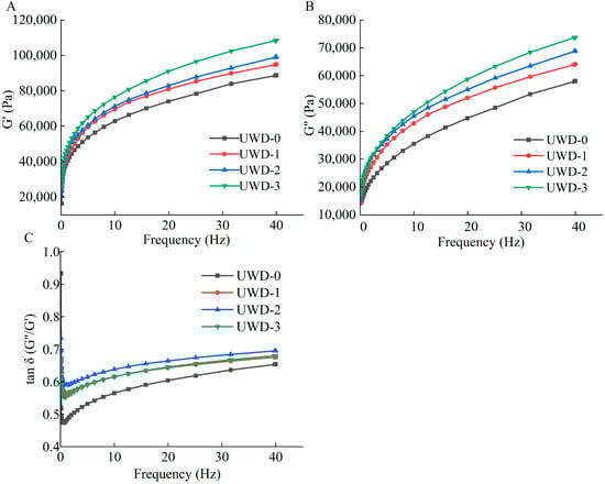 Figure 1 illustrates the impact of fucoidan on the rheological properties of dough. As shown in Figure 1A,B, the values of G′ and G″ increased with the increase in frequency in all samples within the 0.1–40 Hz range. The elasticity of the dough was denoted by the storage modulus (G′), indicating the extent of deformation, while the loss modulus (G″) reflected the viscosity properties [37]. The value of G′ was higher than the value of G″ throughout the frequency range for UWD-0, UWD-1, UWD-2 and UWD-3, indicating the predominant solid-like behaviors within the dough [38]. Tan δ is obtained by G″/G′, which indicates the relationship between G′ and G″. The higher the value of tan δ in the dough, the higher the viscosity prevailed in the doughs and the higher the gluten protein network weakened [39,40]. As shown in Figure 1C, the values of tan δ ranged between 0.1 and 1 in UWD-0, UWD-1, UWD-2 and UWD-3. UWD-1, UWD-2 and UWD-3 had higher values of tan δ compared with those in UWD-0. The above results showed that the viscosity of the dough increased and the gluten network weakened as fucoidan added.