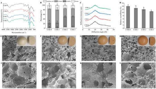 Effects of fucoidan of the structural properties of CSB. (A) FT-IR spectra; (B) Relative proportion of secondary structure; (C) XRD; (D) Relative crystallinity of starch; (E–H) SEM images of CSB samples at 30×; (I–L) SEM images of CSB samples at 200×. Different letters (a, b, c) indicate significant differences (p < 0.05).