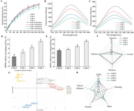 Effects of fucoidan of on the functional properties and sensory of CSB. (A) In vitro starch digestibility of CSB; (B) Fluorescence quenching of α-amylase; (C) Fluorescence quenching of amyloglucosidase; (D) DPPH· radical scavenging activity; (E) ABTS· radical scavenging activity; (F–H) Sensory analysis. Different letters (a, b, c, d) indicate significant differences (p < 0.05).