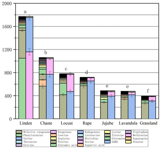 Figure of total free amino acid concentrations (column 1) and total endogenous, exogenous, and relative exogenous amino acid concentrations (column 2) in different types of honey. (The same letter above the bar graph indicates that the value is not statistically significant (p ≥ 0.05)).