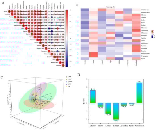 Figure 3A,B shows the effect of honey source on amino acid composition. Among the 20 amino acids from seven different sources of honey, Met and Ala had the highest negative correlation number (r = −0.82).The maximum values of Pearson correlation coefficients were similar to those of Thr and Ser (r = 1), Ile and Leu (r = 0.96), Leu and Val (r = 0.96), Leu and Gly (r = 0.93), Ala and Leu (r = 0.89), Val and Ile (r = 0.93), Ile and Gly (r = 0.89), Gly and Ala (r = 0.93), and Ala and Val (r = 0.86), suggesting that these amino acids are usually the most effective indicators of honey.
