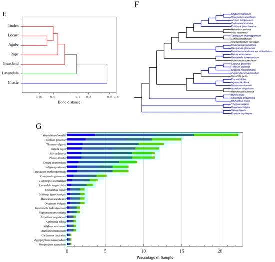 The most detected nectar plants in the 174 samples were Sisymbrium loeselii (22.4%) and Trifolium pratense (14.94%), and the other nectar plants, in descending order of abundance, were Thymus vulgaris, Ballota nigra, Salvia deserta, Prunus triloba, Datura stramonium, Lathyrus pratensis, Taraxacum erythrospermum, Campanula glomerata, Codonopsis clematidea, Lavandula angustifolia, Rhinanthus minor, Echinops tjanschanicus, Heracleum candicans, Origanum vulgare, Gentianella turkestanorum, Sophora moorcroftiana, Aconitum tanguticum, Agrimonia pilosa, Silybum marianum, Arctium tomentosum, Carthamus tinctorius, Zygophyllum macropodum and Onopordum acanthium (Figure 3G).