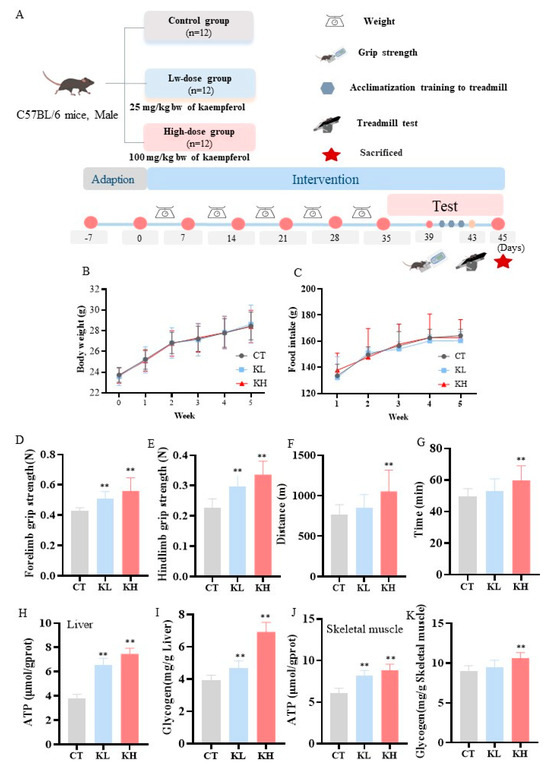 Effect of kaempferol on body weight, food intake, grip strength, exercise capacity, ATP, and glycogen in mice. (A) Experimental study design; (B) body weight; (C) food intake; (D) forelimb grip strength; (E) hindlimb grip strength; distance (F) and duration (G) of exercise until exhaustion; ATP (H) and glycogen (I) in the liver; and ATP (J) and glycogen (K) in skeletal muscle. CT, control group, 0.5% (wt./vol) solvent carboxymethyl cellulose sodium (CMC); KL, 25 mg/kg bw of kaempferol; KH, 100 mg/kg bw of kaempferol; and bw, body weight. **, p < 0.01.