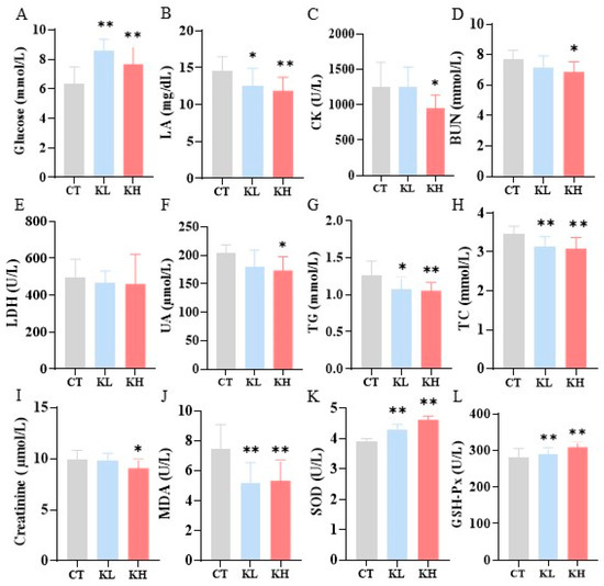 Effect of kaempferol on serum biochemical parameters in mice. (A) glucose; (B), lactic acid (LA); (C), creatine kinase (CK); (D), blood urea nitrogen (BUN); (E), lactate dehydrogenase (LDH); (F), uric acid (UA); (G), triglyceride (TG); (H), total cholesterol (TC); (I), creatinine; (J), malondialdehyde (MDA); (K), superoxide dismutase (SOD); (L), glutathione peroxidase (GSH-Px). CT, control group, 0.5% (wt./vol) solvent carboxymethyl cellulose sodium (CMC); KL, 25 mg/kg bw of kaempferol; KH, 100 mg/kg bw of kaempferol; bw, body weight. *, p < 0.05; **, p < 0.01.