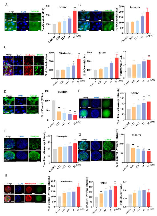 Effect of kaempferol on glucose uptake, mitochondrial mass, mitochondrial membrane potential, reactive oxygen species (ROS), and protein synthesis in vitro (C2C12 myotubes, cultured in 2D and 3D). The mean stain area (MSA) of 2-NBDG (A), puromycin (B), TMRM and MitoTracker (C), and CellROX (D) in C2C12 myotubes cultured in 2D. The average intensity of 2-NBDG (E), puromycin (F), CellROX (G), and TMRM and MitoTracker (H) in C2C12 myotubes cultured in 3D. Left panel: representative images, bar size: 50 μm (2D) and 100 μm (3D). The assays were performed in triplicate with three technical replicates. *, p < 0.05; **, p < 0.01.
