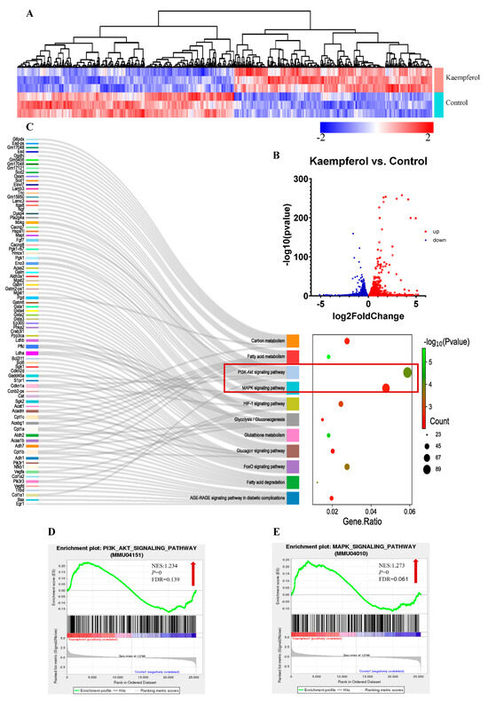 RNA-sequencing data induced by kaempferol in C2C12 myotubes. (A) Heatmap of gene expression levels in the control and kaempferol groups; (B) differentially expressed genes (DEGs) in C2C12 cells; p < 0.05 and |log2(Fold Change)| > 0 was seen as DEGs; (C) Sankey dot pathway enrichment (p < 0.05) from DEGs; and PI3K/AKT (D) and MAPK (E) signaling pathways of GSEA analysis.