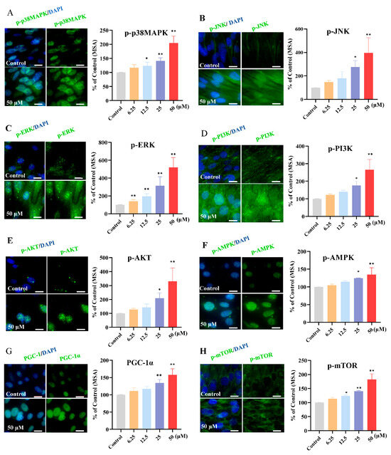 Protein expression/phosphorylation of markers of MAPK and PI3K-AKT signaling pathways. p-p38 MAPK (A), p-JNK (B), p-ERK (C), p-P13K (D), p-AKT (E), p-AMPK (F), PGC-1α (G), and mTOR (H) were detected with a high-content imaging analysis system. (A): representative images, bar size: 50 μm. The assays were performed in triplicate with three technical replicates. *, p < 0.05; **, p < 0.01.