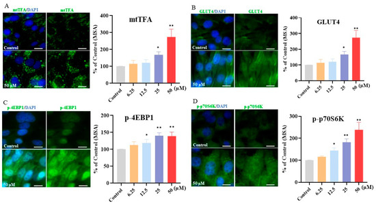 Protein expression/phosphorylation of downstream maker targeted to biological functions in C2C12 myotubes. Protein expression of mtTFA (A) and GLUT4 (B) and the phosphorylation of 4EBP1 (C) and p70S6K (D) were detected with a high-content imaging analysis system. Left panel: representative images, bar size: 50 μm. The assays were performed in triplicate with three technical replicates. *, p < 0.05; **, p < 0.01.