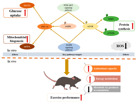 With the escalating global popularity of recreational sports and fitness culture, improving exercise capacity safely and legally has become an increasingly crucial research goal [1]. A decline in exercise capacity and premature exercise-induced fatigue are closely associated with the function of skeletal muscles [2]. Energy deficiency emerges as the primary contributor, where the depletion of glycogen and glucose results in insufficient adenosine triphosphate (ATP) production and compromised contractile function. Enhancing mitochondrial biogenesis and oxidative phosphorylation increases ATP production in response to the increased energy demands that occur during exercise, whereas promoting glycogen synthesis and glucose uptake helps maintain intracellular energy stores for prolonged contraction [3]. The accumulation of reactive oxygen species (ROS) produced by the mitochondrial respiratory chain also causes fatigue, decreasing exercise performance [4]. Conversely, it is of paramount importance to ensure the effective disposal of metabolic byproducts, such as lactic acid (LA) and blood urea nitrogen (BUN), whose accumulation could detrimentally affect muscular functions and the overall operational efficiency [5,6,7].