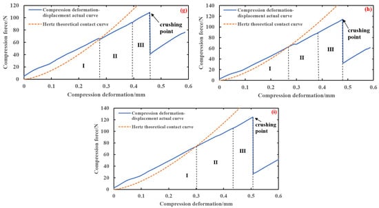 - The results of the single compression and crushing test of brown rice kernels showed that the maximum compression forces Fc of Hunan Early indica 45, Hunan Glutinous 28, and Southern Japonica 518 kernels were 134.77 ± 11.20 N, 115.64 ± 4.35 N, and 115.84 ± 5.89 N, respectively; the maximum deformation amounts were αc 0.51 ± 0.04 mm, 0.43 ± 0.01 mm, and 0.48 ± 0.17 mm, respectively; and the average critical values of elastic–plastic deformation αs were 0.224 mm, 0.267 mm, and 0.280 mm, respectively.