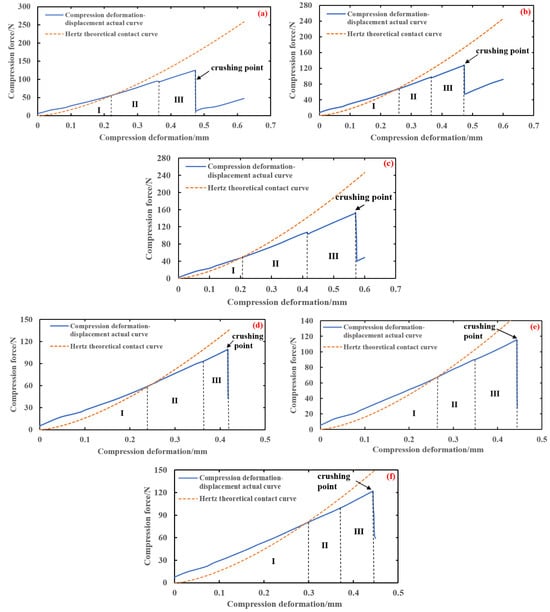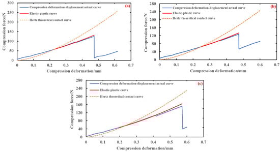 In order to verify the accuracy of the elastic–plastic model of brown rice kernels, according to the known conditions in Table 3, the elastic–plastic compression model curves of the brown rice kernels of Hunan Early indica 45, Hunan Glutinous 28, and Southern Japonica 518 varieties were computed and plotted using Equation (21), and the actual compression curves of the three varieties of brown rice kernels were analysed in comparison with the curves of their Hertz contact model.