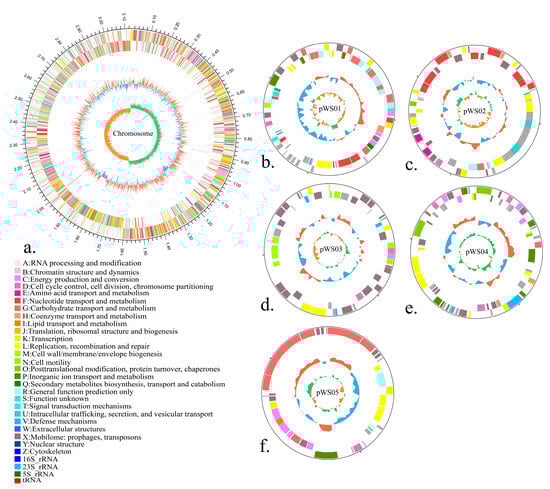 Graphical circular map of the chromosome (a) and plasmids (b–f) of Lactiplantibacillus plantarum JS21. Circles from outside to the center: genes on forward strand (color by COG categories); genes on reverse strand (color by COG categories); GC-content; GC skew.