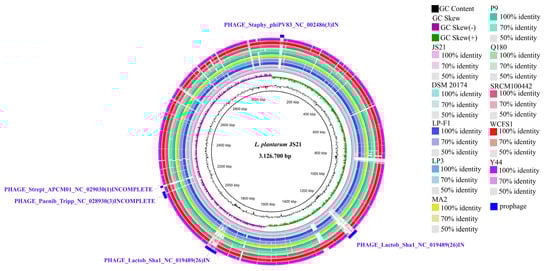The BLAST Ring alignment of Lactiplantibacillus plantarum JS21 versus other compared well-known Lactiplantibacillus plantarum genomes, which are aligned from the outer side to the inside as Y44, WCFS1, SRCM100442, Q180, P9, MA2, LP3, LP-F1, DSM 20174, and JS21, respectively. The GC content is illustrated in the 2nd inner circle before the genome of JS21. The GC skew (+/−) of the genome of JS21 is also shown in the third inner circle, and in the first inner circle, the genome size is demonstrated. On the other hand, prophage regions of the strain JS21 are depicted as blue colored arcs in the outer circle. The numbers in parentheses showed the number of matched proteins of the phages. At the end of the phage names, IN indicates intact, and INCOMPLETE indicates incomplete.