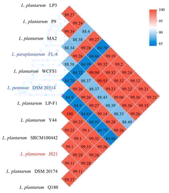 Average nucleotide identity (ANI) values of Lactiplantibacillus plantarum JS21 and other compared well-known Lactiplantibacillus species.