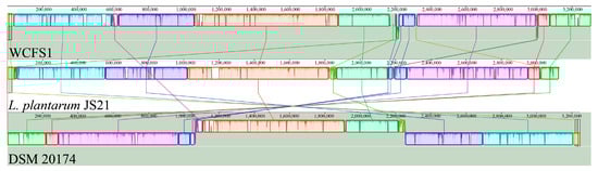 Collinearity analysis was employed to investigate genome correlation by identifying homologous sequences and examining their arrangement consistency among different individuals of the same species [53]. WCFS1 and DSM 20174, because of their high ANI values, were selected for collinearity analysis with JS21 (Figure 4). The analysis revealed 14.402 kb locally collinear blocks (LCB) at 38.713 kb of the JS21 genome, exhibiting 78.8% identity with WCFS1 and a genomic translocation, which was absent in DSM 20174. Additionally, at 1.830 Mb of LCB, a 36.374 kb fragment showed good collinearity with DSM 20174, while WCFS1 exhibited numerous fragment deletions. A 3.075 kb fragment at 2.190 Mb was consistent with WCFS1, but a deletion was observed in DSM 20174. JS21 harbored unique fragments, including a 6.113 kb segment at genome position 1.824 Mb, containing genes encoding LysM peptidoglycan-binding domain-containing protein and sadA annotated as a phage tail protein. Furthermore, JS21 contained unique 2.394 kb fragments encoding the parA gene at genome position 2.156 Mb, possibly involved in DNA cleavage according to COG database annotation. These above sequence regions were located in predicted prophage regions based on annotation information. JS21 also possessed a 2.951 kb unique fragment at 3.019 Mb, containing the gene encoding α-galactosidase (galA). Moreover, a 1.353 kb unique fragment encoded the LacI family transcriptional regulator gene at 3.023 Mb. The results indicated good collinearity between JS21 and WCFS1, with significant genetic differences observed between JS21 and DSM 20174. Studies have suggested that, when a gene is located at the edge of a translocation region, it may be interrupted, leading to substantial changes in the DNA sequence [54].