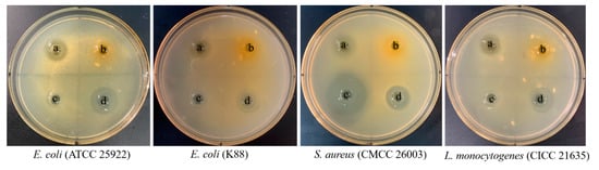 The inhibition zone diameters of JS21 against E. coli ATCC 25922, E. coli K88, S. aureus CMCC 26003 and L. monocytogenes CICC 21635. a—CFS; b—NC; c—Ampicillin; d—Kanamycin.