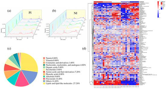 Total ion chromatograms of different LS cultivars in positive ions (a) and negative ions (b). Classification of metabolites identified in LS (c). Heatmap analysis of the relative content of metabolites in different LS cultivars (d).