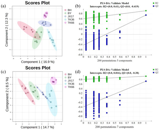 The PLS-DA score plots for different LS cultivars: (a) positive ion mode and (c) negative ion mode. The permutation test results of the PLS-DA model: (b) positive ion mode and (d) negative ion mode.