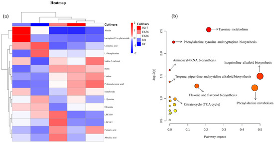 Metabolic pathway enrichment analysis of the 15 differential metabolites was conducted using the KEGG database and the results are shown in a bubble chart (Figure 3b) [46]. The bubbles represented the metabolic pathways, while the horizontal coordinates and size of the bubbles represented influencing factors of the metabolic pathways. The p-value of the enrichment analysis was represented by the vertical coordinate and color of the bubbles. Tyrosine metabolism, phenylalanine, tyrosine and tryptophan biosynthesis, aminoacyl-tRNA biosynthesis, isoquinoline alkaloid biosynthesis, tropane, piperidine and pyridine alkaloid biosynthesis, and flavone and flavonol biosynthesis were mainly enriched pathways. These metabolic pathways were mainly associated with amino acid metabolism as well as the biosynthesis of amino acids, alkaloids, and flavonoids. These results showed that cultivars were strongly influencing the biosynthesis of secondary metabolites in LS. The differential metabolic pathways among LS cultivars need to be further identified in combination with other omics in the future.