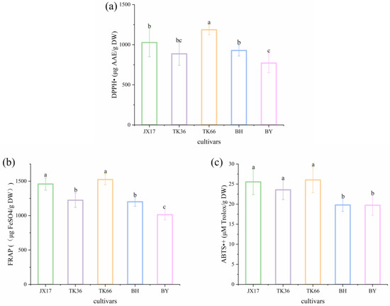 The antioxidant activities of different LS cultivars: (a) DPPH•, (b) FRAP, (c) ABTS•+. Values with different letters show a significant difference (p < 0.05).