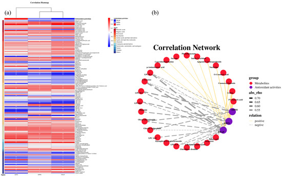 The correlation heatmap (a) and correlation network (b) among antioxidant activities and the relative content of metabolites. * indicated p < 0.05; ** indicated p < 0.01.
