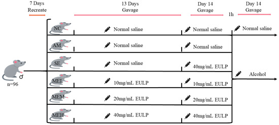 Four-week-old specific pathogen-free (SPF) Kunming male mice (24–32 g) were purchased from Zhejiang Weitong Lihua Experimental Animal Technology Co., Ltd. (No. SCXK (zhe) 2019-0001). During the whole experimental period, the mice were raised in the animal room under standard conditions (room temperature 23 ± 2 °C, relative humidity 50 ± 10%, 12 h light and darkness cycle) for 7 days with free access to basal food and water. Ninety-six healthy mice were then divided into six groups randomly (16 mice per group): Normal control group (the NC group); Alcohol model group (the AM group); A single gavage of the highest-dose EULP group (the SE group); Multiple gavages of the low-dose EULP group (the MEL group); Multiple gavages of the medium-dose EULP group (the MEM group); Multiple gavages of the high-dose EULP group (the MEH group).