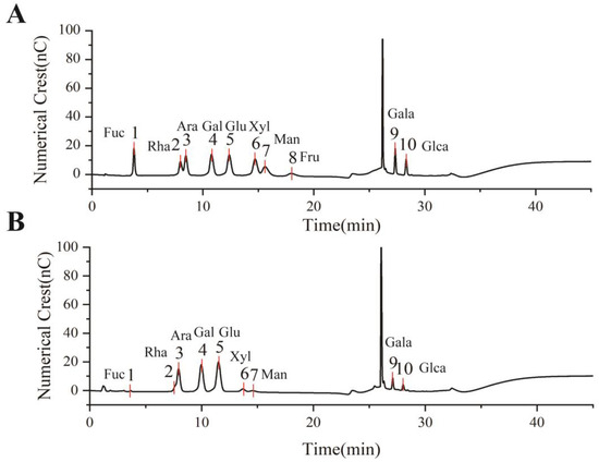 Monosaccharide analysis of EULP using an ion chromatogram. (A) The retention time of 10 monosaccharide standards. (B) The ion chromatogram of EULP.