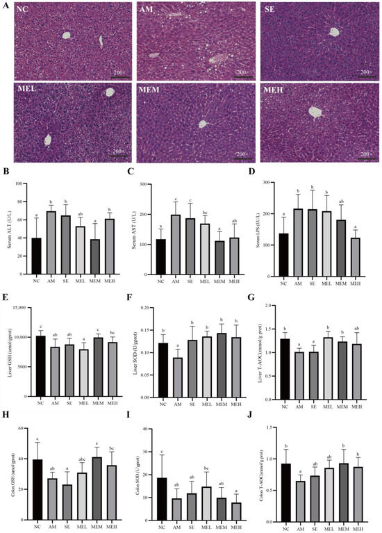EULP alleviated liver and intestine injury and oxidative stress in mice with acute alcoholism. (A) Representative microscopic images of mouse liver after H&E staining (200×). Quantification of ALT (B) and AST (C) in mice serum. (D) Quantification of LPS in mice serum. Quantification of GSH (E), SOD (F), and T-AOC (G) in mice liver. Quantification of GSH (H), SOD (I), and T-AOC (J) in mice colon. Data are presented as mean ± S.D. (n = 6) and analyzed using one-way ANOVA followed by Tukey’s post hoc test. Groups with different letters are significantly different from each other.