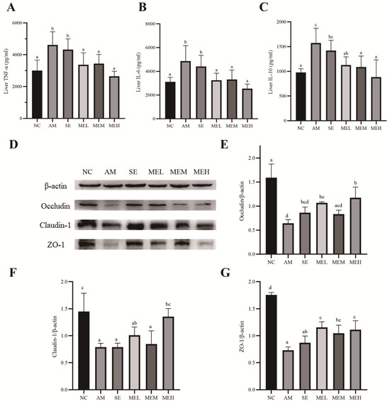 EULP alleviated liver inflammation and colon TJ protein expression in mice with acute alcoholism. Quantification of TNF-α (A), IL-6 (B), and IL-10 (C) in mice liver (n = 6). Western blotting for the tight-junction proteins (TJ) in the colon (D). Quantitative analysis of Occludin (E), Claudin-1 (F), and ZO-1 (G) in the colon tissue (n = 3). Data are presented as mean ± S.D. (n = 6) and analyzed using one-way ANOVA followed by Tukey’s post hoc test. Groups with different letters are significantly different from each other.