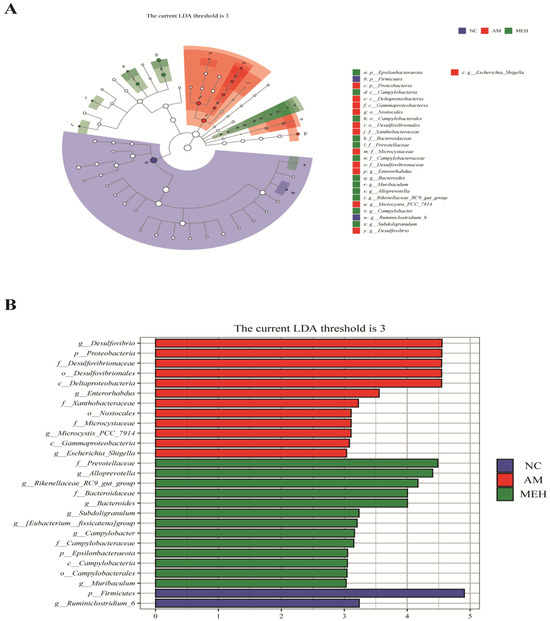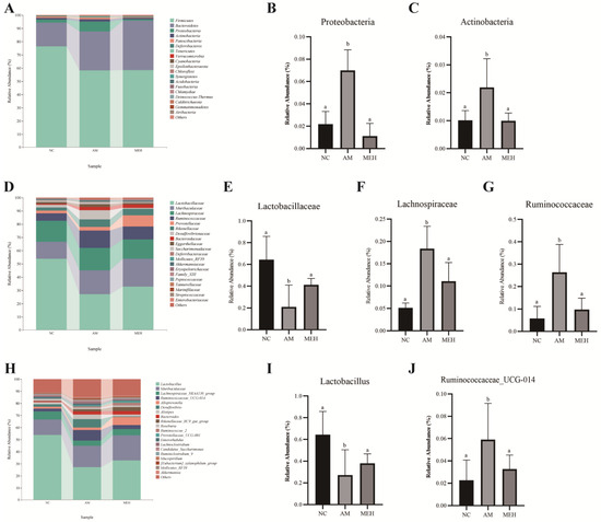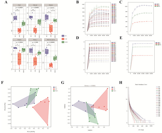 Through OTU analysis, the number of unique and common OTUs in each group can be shown. The unique OTU numbers of the NC group, AM group, and the MEH were 961, 1460, and 1753, respectively. The number of OTUs in the AM group, and the MEH and NC groups, was 151 and 201, respectively, indicating that the OTU similarity between the MEH group and the normal group was higher than that of the model group. The total number of OTUs was 611. The average OTU of each sample was 682.8333. The results from the OTU analysis indicated that the rank–abundance curve of bacterial communities in the NC, AM, and MEH groups exhibited a similar pattern, albeit with different microbial compositions.
