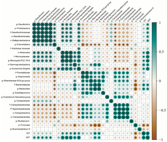 Correlation analysis between the relative abundance of the main genus in the gut microbiota and the liver injury biomarkers (ALT and AST). Blue squares represent positive correlations, brown squares represent negative correlations, and white squares represent no correlations. * indicates a significant p value < 0.01.