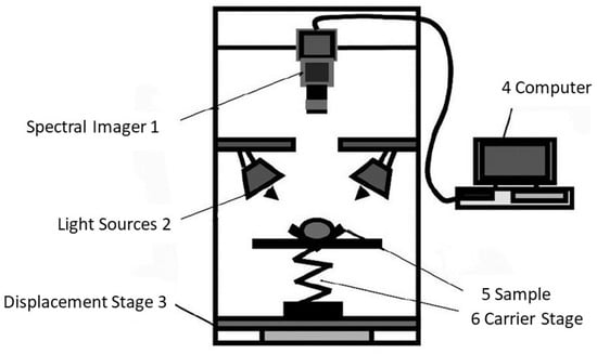 Hyperspectral imaging (HSI) technology is a rapid, nondestructive, and intelligent detection technique with timely results. The HSI detection device depicted in Figure 1 consists of a hyperspectral camera, an imaging spectrometer, a fiber optic halogen lamp, and a computer [29]. The technology is based on spectral images; HSI combines spectral data and computer images when a halogen lamp emits a beam of light on the sample, and the hyperspectral camera receives the light reflected by the sample, takes pictures, and captures the optical properties of the same crop over a continuous wavelength range.