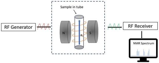 NMR is an important technique that utilizes the magnetic properties of atomic nuclei to study the structure, dynamics, and interactions of compounds without damaging the sample. Currently, NMR techniques are categorized into various types depending on the object to be measured, including 1H, 13C, 19F, and 31P. Since hydrogen atoms are widely present in many compounds, 1H spectroscopy is one of the most widely used quantitative NMR methods. The nucleus of an atom with a fixed magnetic moment absorbs electromagnetic waves of a specific frequency in the presence of a magnetic field, jumps from a low energy level to a high energy level, and generates a detection signal. By analyzing the NMR spectra formed by these signals, the structure, dynamics, and interactions of the compounds in the sample can be understood. This technique can be divided into two categories: low-field NMR technology and high-field NMR technology. Low-field NMR detection technology utilizes a magnetic field strength of less than 0.5 T. The instruments used for this method are affordable and widely employed in practical applications due to the lower magnetic field strength. In contrast, high-field NMR detection technology refers to nuclear magnetic resonance conducted with a magnetic field strength exceeding 1.5 T. The higher magnetic field strength in this method results in a superior signal-to-noise ratio, increasing the accuracy and sensitivity of the measurements. Therefore, depending on the desired application and equipment budget, researchers can choose between low-field NMR or high-field NMR for their studies. Both techniques provide insight into and identification of the structure of a sample and play an important role in various scientific fields. NMR technology is widely used in various industries such as agriculture, energy, medical treatment, and food safety due to its simplicity, minimal sample damage, rapid detection speed, and its ability to provide quantitative and qualitative analysis when combined with chemometrics [49,50]. Figure 4 illustrates a simplified schematic of the NMR system. The underlying principle of NMR technology involves the application of a radio frequency (RF) excitation source to administer a specific frequency RF signal to the sample. When the sample is exposed to the RF signal, the hydrogen nuclei within undergo NMR phenomena and absorb energy. Subsequently, the nuclei in the sample relax at a specific frequency and amplitude, releasing energy. By measuring the relaxation time width of each nucleus, it becomes possible to calculate the concentration of each nucleus and the content of other chemical components in the sample [51,52,53].