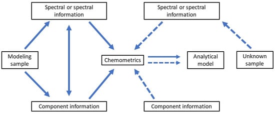 Most advanced detection technologies integrate spectral and frequency data with chemometrics and machine learning to enable intelligent detection of fruit and vegetable components. The detection process is outlined in Figure 6. This comprehensive analysis typically comprises two primary stages: data correction and prediction. The solid-line segment represents the data correction phase, which aims to establish functional relationships. Initially, spectral or frequency data of fruits and vegetables are captured by the device, and their compositional details are determined using conventional analytical methods. Subsequently, chemometrics is applied to remove noise from the spectra or frequency data and correlate it with compositional data to construct an analytical model. The dotted-line segment illustrates the prediction phase. Here, information about the fruit and vegetable under assessment is collected, processed, and fed into the model. Once the model completes its analysis, it facilitates swift and intelligent detection of fruit and vegetable composition [64,65].