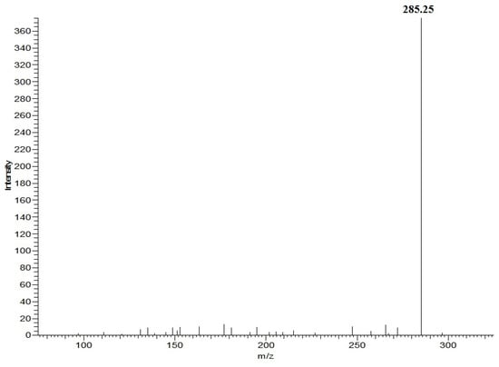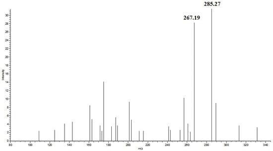 Through the analysis of the SRM chromatogram of fatty acids ethyl ester, it is found that the parent ion fragmentation mechanism of saturated and unsaturated fatty acids ethyl ester was different. It is not hard to find that the mass-to-charge ratio differs for the parent ion and the product ion in saturated and unsaturated fatty acids ethyl ester, which were 28 and 46, and according to the molecular structure, this may be due to neutral loss of CH2=CH2 and CH3CH2OH. The mass difference between the parent ion (m/z 331.3) and product ion (m/z 285.3) for ethyl eicosapentaenoate was due to the neutral loss of CH3CH2OH (Figure 2). The mass difference between the parent ion (m/z 313.3) and product ion (m/z 285.3) for ethyl stearate was due to the neutral loss of CH2=CH2 (Figure 3). Therefore, ethyl palmitate, ethyl stearate, ethyl oleate, ethyl arachidonate, ethyl eicosapentaenoate, ethyl docosapentaenoate, and ethyl docosahexaenoate were identified in EEFFO (Table 2).