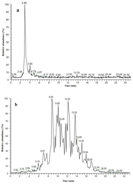HPLC–MS is the most widely used technology in lipid analysis. There are significant differences between TGFFO and EEFFO samples in the total ion chromatogram of LC-APCI-LIT/MS, as shown in Figure 4. One chromatographic peak was observed for the EEFFO sample (Figure 4a). This peak at a retention time of 2.86 min, which overlaps the peaks of ethyl eicosapentaenoate and ethyl docosahexaenoate, was assigned as “characteristic peaks” of the EEFFO sample. The lipid separation results for TGFFO from LC-APCI-LIT/MS are shown in Figure 4b. TGFFO has many TAG chromatographic peaks like fingers at retention times of 6 min to 20 min. Therefore, it is relatively easy to differentiate between TGFFO and EEFFO using total ion chromatogram fingerprints.