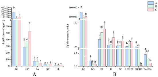 The differences of three types of pecans. (A) The difference comparison in lipid concentration among the lipid classes from the three types of pecans. (B) The difference comparison in lipid concentration among the lipid subclasses from the three types of pecans. A, Type A; B, TypeB; C, Type C; GL, glycerolipids; GP, glycerophospholipids; FA, fatty acyls; SP, sphingolipids; SL, saccharolipids; TG, triglyceride; DG, diacylglycerol; PE, glycerophospholipid; PI, phosophatidylinositol; PC, choline glycerophsopholipid; LNAPE, N-acyl-lysophospahtidylethanolamine; HETE, hydroperoxyeicosatetraenoic acid; FAHFA, fatty acid ester of hydroxy fatty acid. (a), (ab), (b) means within each column with different letters are significantly (p < 0.05) different.