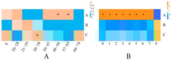 The differences in lipid chain length and unsaturation content of three types of pecans. (A) Lipid chain length. (B) Lipid unsaturation. A, Type A; B, TypeB; C, Type C. Note: *: there is a significant (p < 0.05) difference in the same column and it is the location where the maximum value occurs.