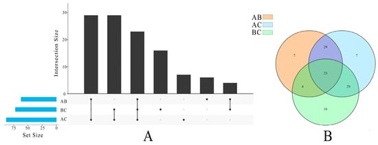 Diagram of lipidomics distinguishes any two types of pecans: (A) histogram; (B) Venn diagram.